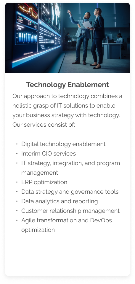 At CEI, our holistic approach to IT consulting blends deep industry expertise with innovative methodologies. We empower your organization to streamline operations, embrace digital transformation, and unlock new avenues for growth.
